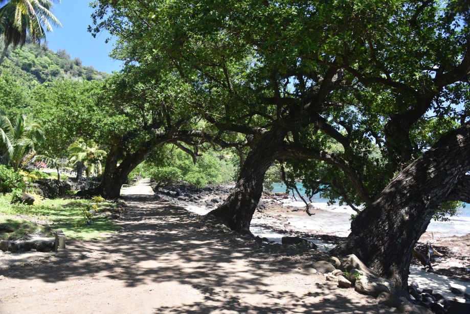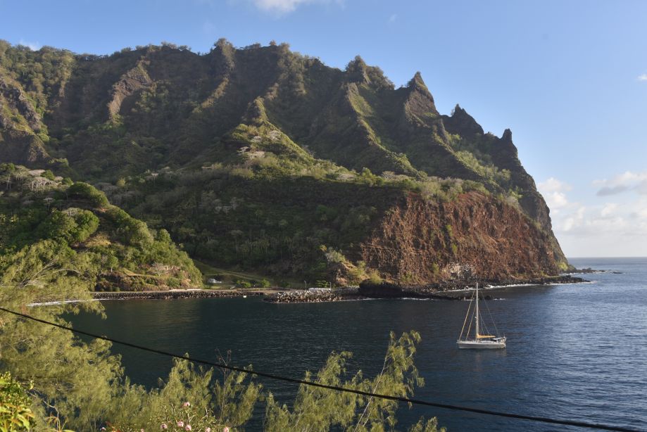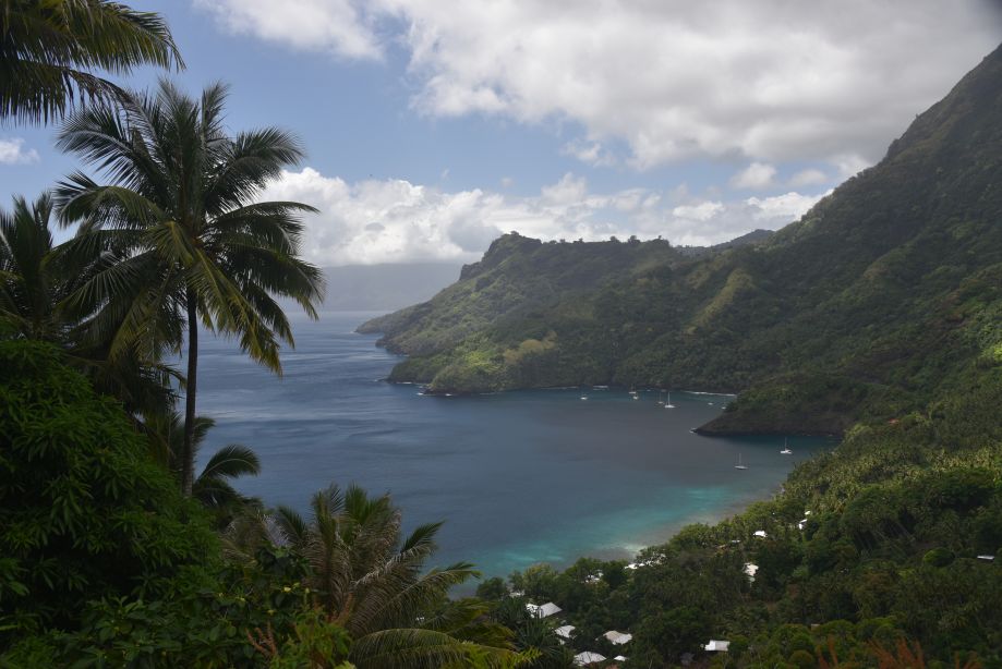 Nous rejoignions ensuite Vaitahu, le village principal, par une piste créé il y a 100 ans par la Reine Vaekehu qui, pour unifier les nombreuses vallées en les reliant, fit cesser les guerres tribales sur l’île. Quatorze kilomètres aller-retour avec de fortes déclivités, à travers une jungle digne de Jurassic Park. Nous irons aussi mouiller devant ce village mais les fortes rafales de vent catabatique nous dissuaderons de rester.