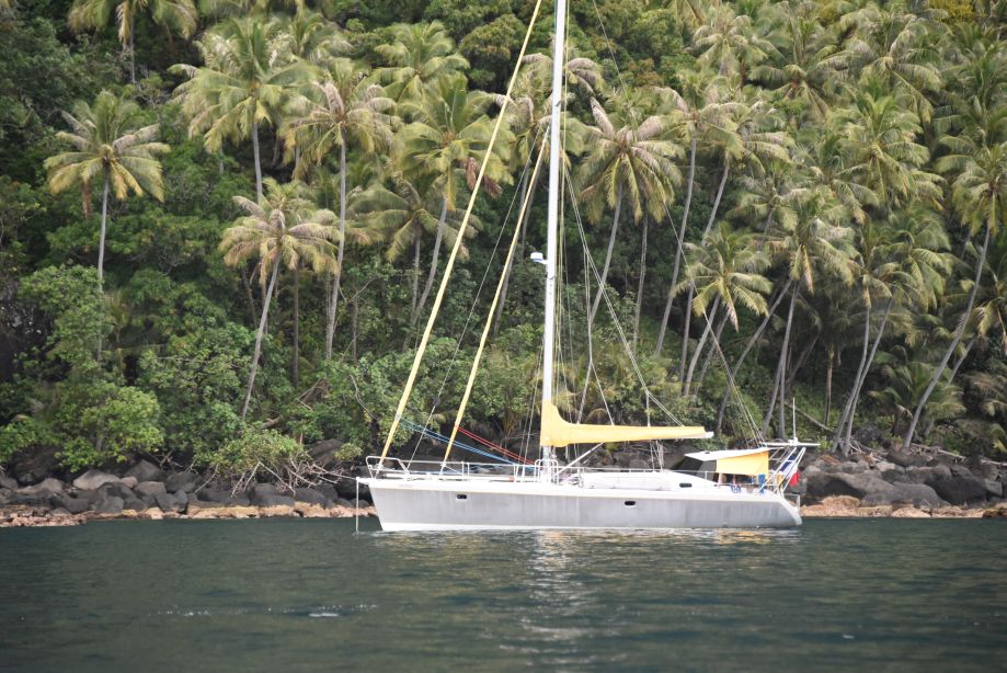 Nous apercevons Olivier de Kersauson qui vit en Polynésie et fait escale avec son trimaran géant à moteur à Hapatoni.