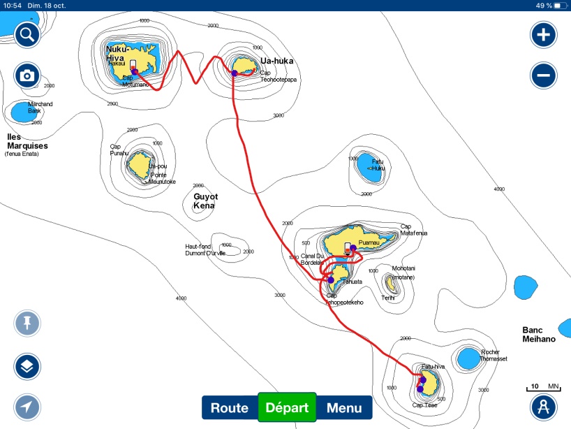 Peine perdue, la houle est trop forte et nous revenons nous abriter sous le vent de l’île. Nous trouvons refuge dans une magnifique petite crique non cartographiée à l’Ouest, dans l’Anse Hatuana, eau translucide, sable blanc et baignade avec un gros requin. On a du mal à s’y habituer… Finalement, après le dîner, vers 21h00 nous levons l’ancre pour un long bord de 75 MN au près, sous voilure réduite, pour arriver au Sud de Tahuata le lendemain vers midi.