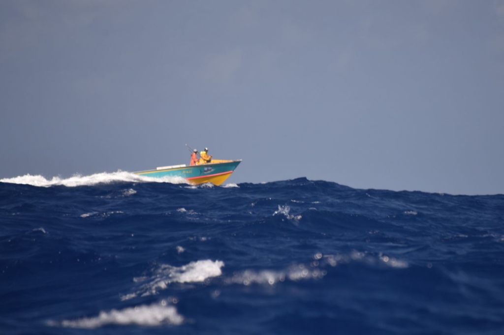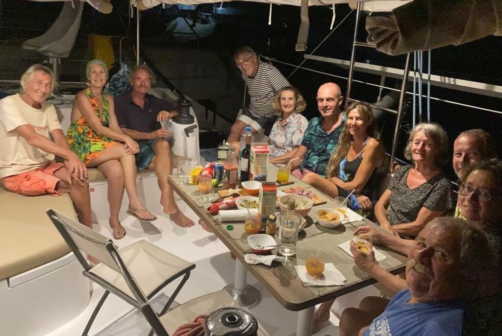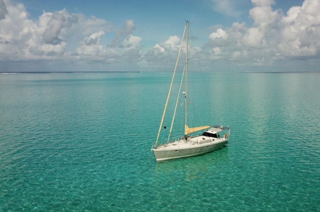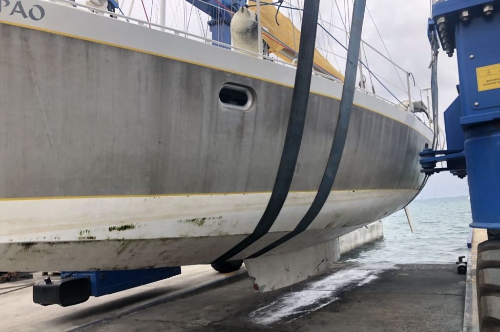 Fred, plus à l’aise sous l’eau, colmate la brèche et moi je limite l’arrivée d’eau qui remonte par un tube creux. Des amis, prévenus de l’incident, organisent notre sortie de l’eau pour le lendemain au chantier de Raiatea.