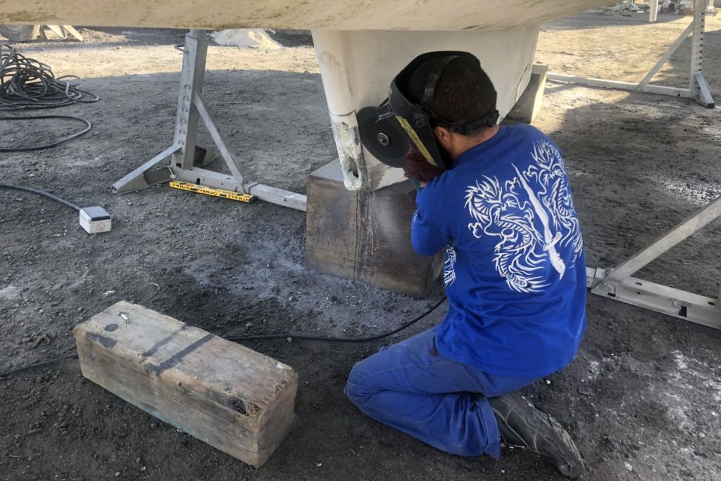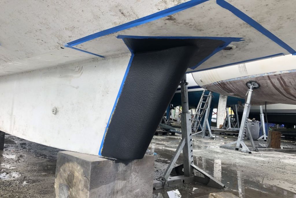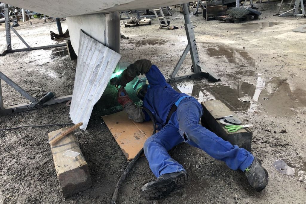 Une expertise rapide d’un technicien du chantier de construction de bateaux aluminium voisin, corroborée par l’architecte d’ORPAO JF André, nous indique la marche à suivre pour les réparations. L’avant du lest est découpé et remplacé par une tôle alu cintrée de 8 mm d’épaisseur et le tube creux est fermé.