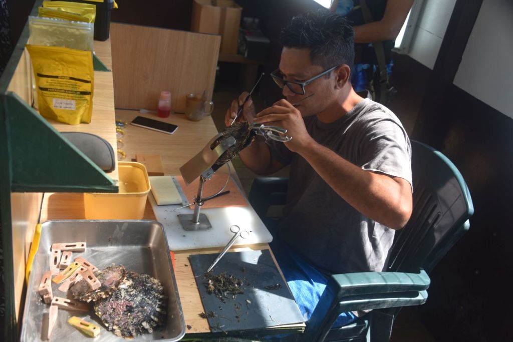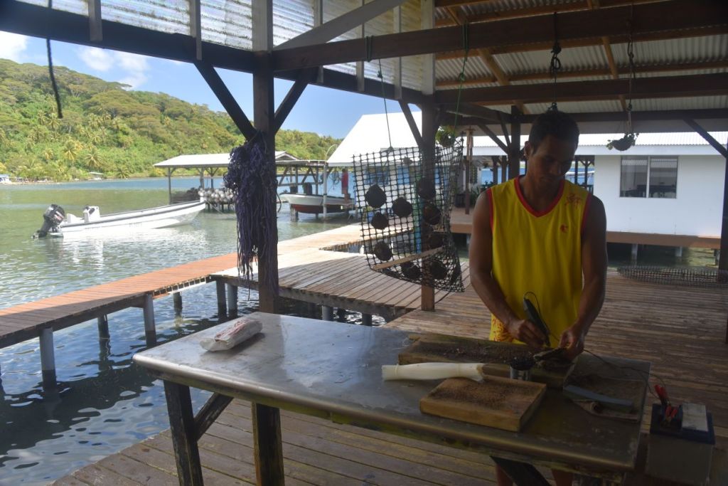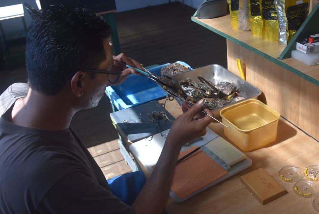 Nous visitons une ferme perlière où des greffeurs introduisent une petite bille dans l’huître qui deviendra, en environ 2 ans, une magnifique perle noire.