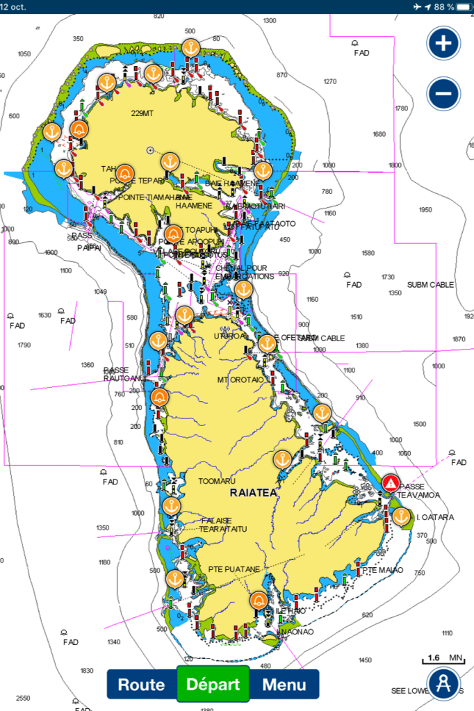 Nous sommes dans les Îles sous le vent et nous quittons Huahine pour Raiatea et Tahaa, deux îles qui partagent le même lagon.