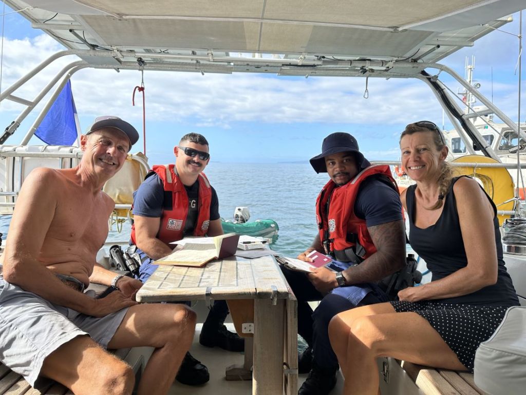 Ils montent à bord et commencent à vérifier papiers, matériel de sécurité et équipements du bateau… jusqu’aux pompes de cales et WC. Le contrôle durera deux heures, réduisant d’autant notre journée de visite… Une bonne âme avait téléphoné aux USCG pour signaler un voilier ancré sans feu de mouillage… Feu que j’avais allumé dès notre retour la veille vers 19 heures. Je m’en tire avec un avertissement pour 3 feux à main périmés et une belle étiquette collée dans le coffre de cockpit m’indiquant qu’il est interdit de rejeter des huiles usées à la mer… Bon, restons calme…