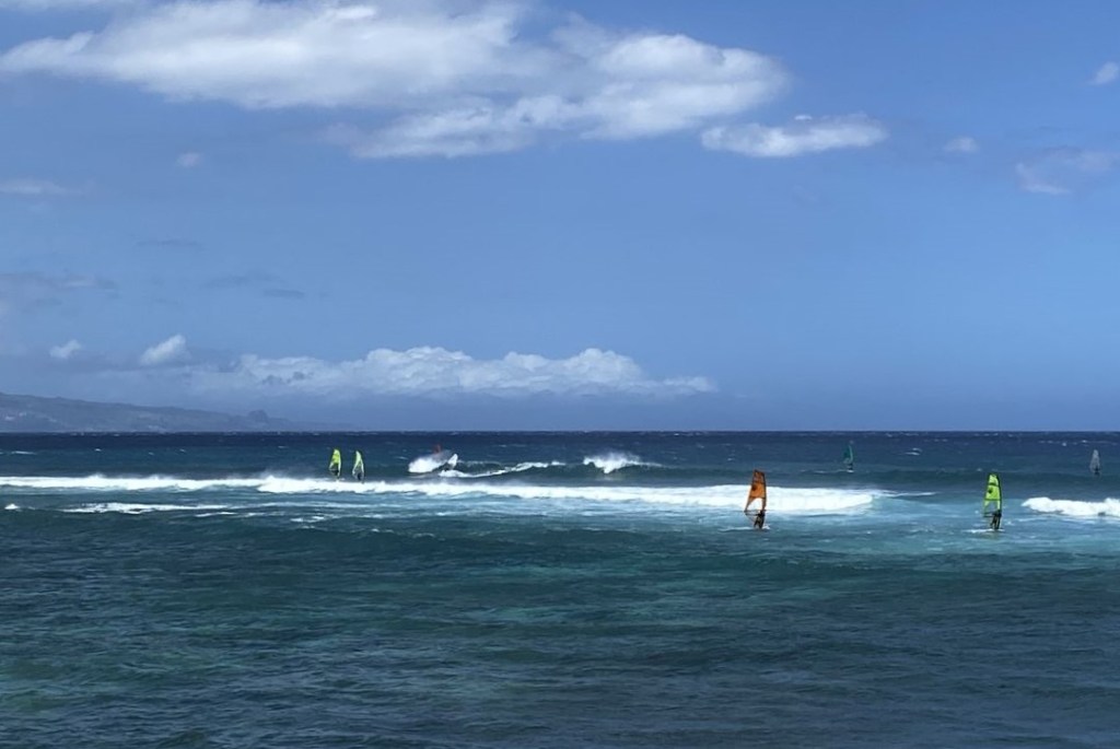 Joey est aussi passionné de voile – il a d’ailleurs été pionnier dans le développement de voiliers de performance à Hawaii – et impressionné par notre parcours. Il nous invite pour une sortie en mer sur son Hokule’a, le catamaran sportif hyper léger et rapide qu’il a dessiné à l’époque pour un aller-retour Hawaii/Tahiti/Hawaii en un temps record (à l’aller, 2500 MN en 10 jours!) malgré un démâtage au retour. Quelques jours plus tard nous faisons donc, accompagnés de son ami Fielding, un aller-retour express dans le canal très venté entre Oahu et Molokai. Malgré le soleil et la température élevée, nous enfilons très vite nos vestes coupe-vent. Ça décoiffe et ça arrose, on nous avait prévenus. Nous remontons le vent à environ 12 noeuds et revenons au portant entre 18 et 25 noeuds… ça change des 6/8 noeuds habituels d’ORPAO…!
