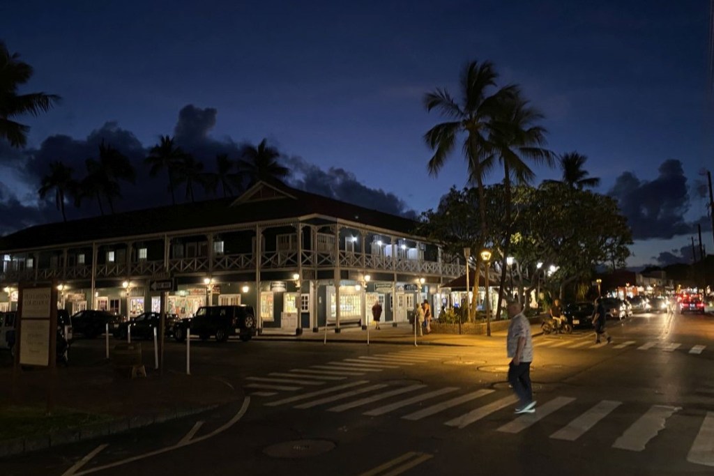 Le lendemain, nous prenons un corps mort au yachtclub de Lahaina, petite ville sur la côte Ouest de Maui qui fut un temps la capitale de l’archipel (jusqu’en 1845) et vécut ensuite exclusivement du tourisme grâce à son port abrité sous le vent de l’île.