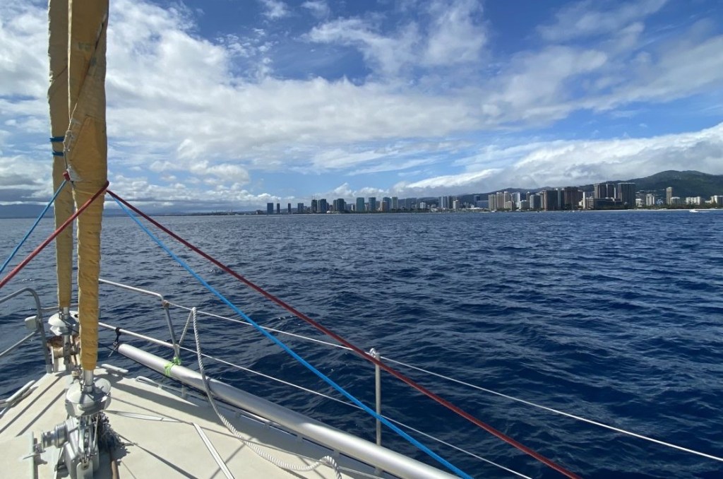 Nous empruntons le chenal d’accès pour rentrer à la marina publique de Ala Wai Small Boat Harbor où, après de longues et pénibles formalités, nous resterons un mois à préparer ORPAO pour l’Alaska et ensuite visiter l’île.