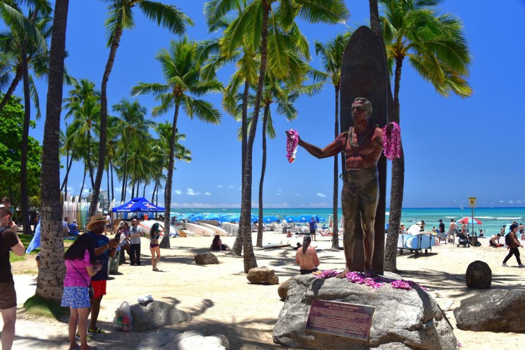 Nous sommes au cœur de Honolulu, au pied de gigantesques hôtels, entourés des fameuses plages de Waikiki d’un côté et Ala Moana de l’autre, de bars, restaurants et magasins de luxe. Un choc quand on arrive de Polynésie française…