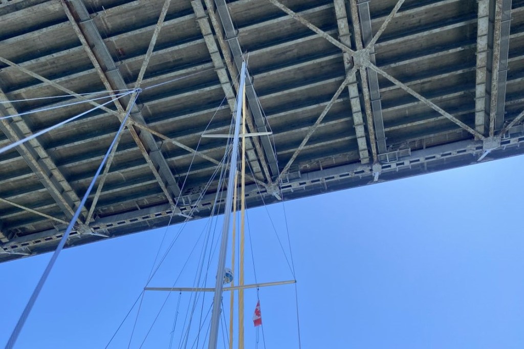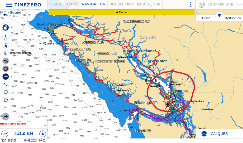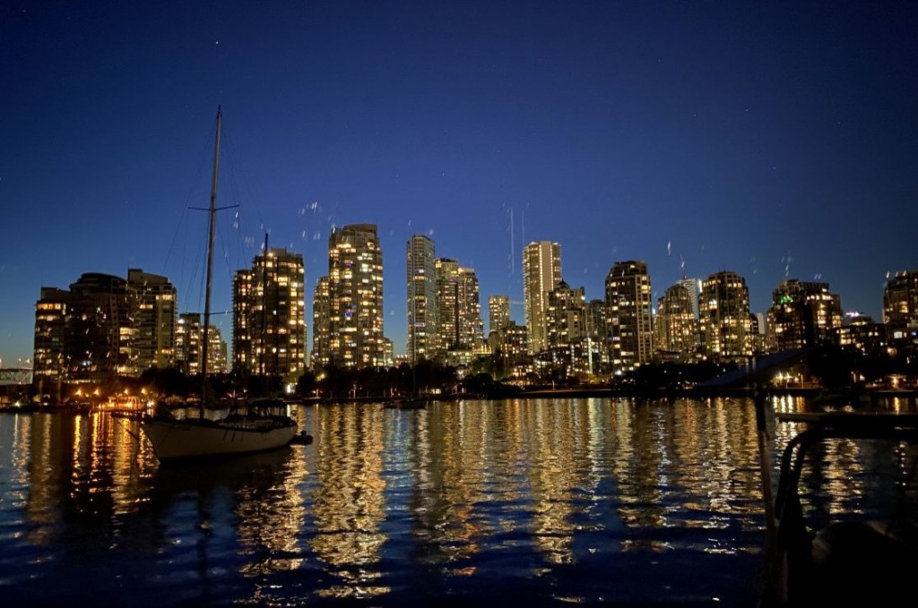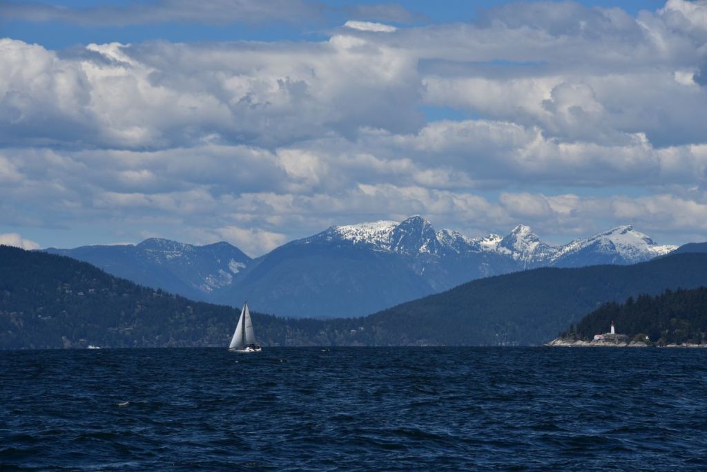 Ensuite nous remontons vers le Nord des Gulf Islands pour traverser le Strait of Georgia qui nous sépare du continent, direction Vancouver City. Ce détroit d’environ 110 MN de long et 20 MN de large n’est pas à prendre à la légère, surtout à cette période l’année. De forts courants de marées contre un vent contraire peuvent rendre la traversée difficile, voire dangereuse pour les petites embarcations. Malgré une bonne météo, nous traversons sous trinquette et 1 ris dans la grand-voile, avec un vent de Ouest/Sud-Ouest à 25 noeuds et des vagues courtes qui montent à l’assaut du pont. Trois heures plus tard nous approchons la ville de Vancouver.