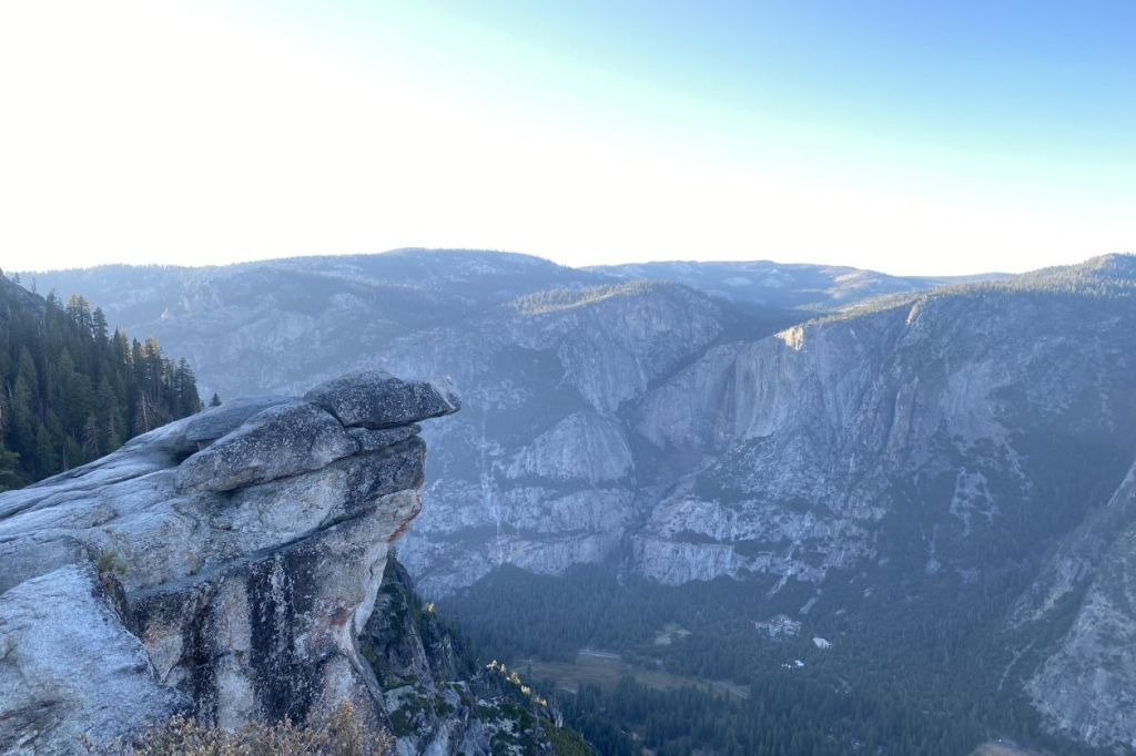 Le soir, après avoir visité la vallée, les campings étant tous complets, nous devons quitter le parc car il est interdit de dormir sur un parking. Néanmoins, nous décidons de rester pour la nuit. Nous nous planquons à Glacier Point à 2200 mètres d’altitude, au bout d’une route en impasse à 50 km, loin des rangers. Le site domine la vallée et nous offre, après une courte marche au coucher du soleil, une vue magnifique sur les différents sommets et la vallée.